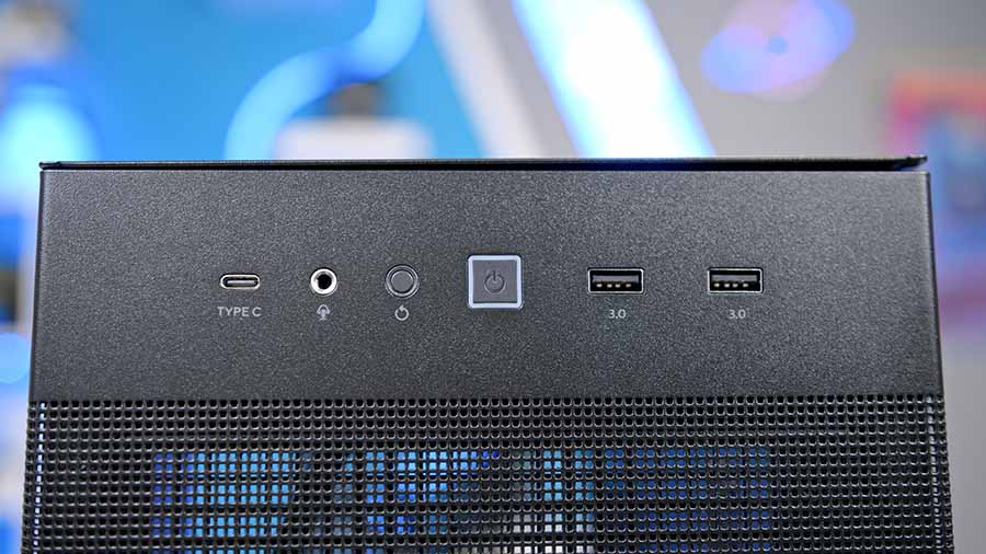 Front IO is mounted horizontally on the front panel; this makes access easy, but it could also heavily interfere with an intentionally sleek-and-minimalist setup, leaving you with unsightly dangling cables and choosing ease and speed over appearance and accessibility. The front IO includes one 20Gbps Type-C port and two USB 3.0 ports for future-ready and backwards-compatible connectivity.