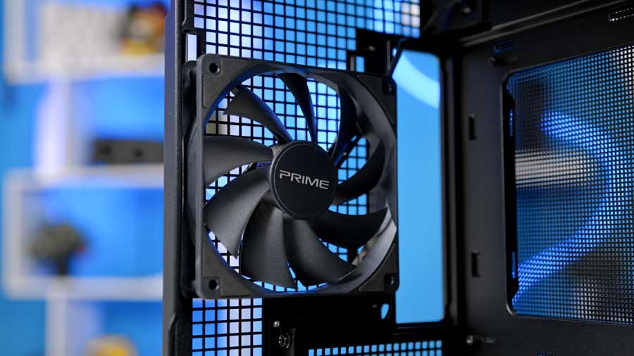 Overall, the ASUS Prime AP303 black tempered glass panel variant offers an elegant appearance with its rich, achromatic black colour. Its rounded edges and matte finish diffuse harsh light, creating a soft glow where it shines on the case. On the glass panel, the word 'PRIME' scrolls across the space where the front and side panels meet, adding subtle branding to the chassis.
