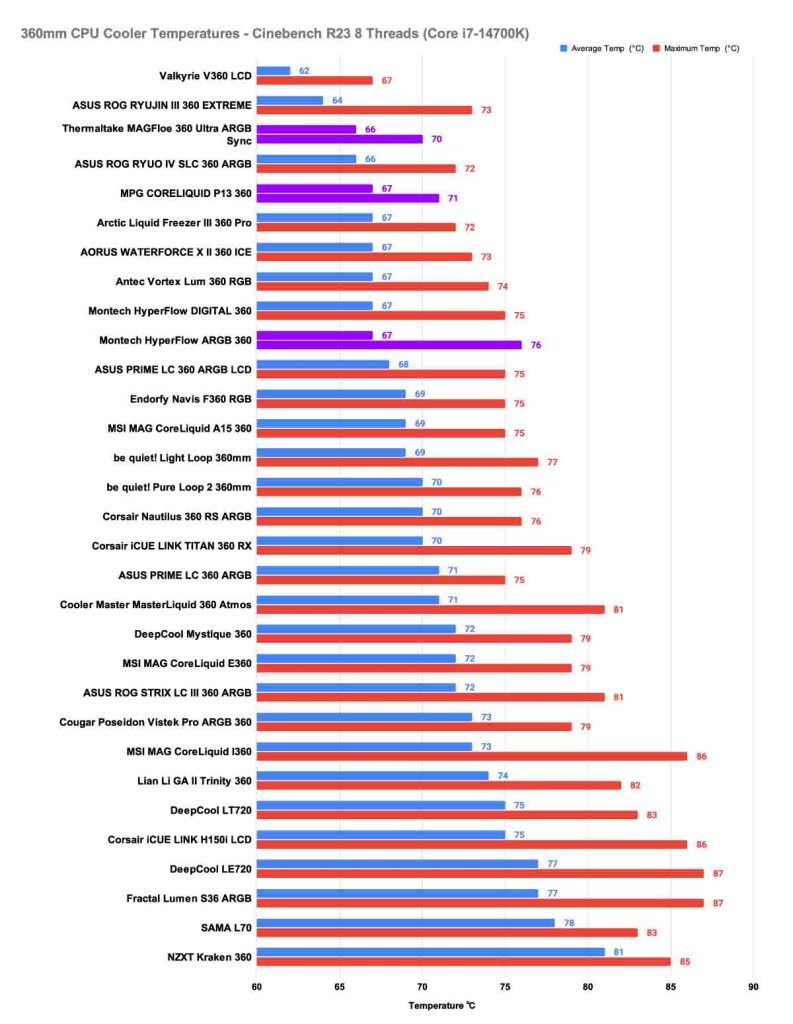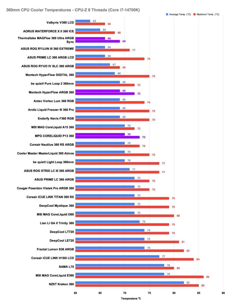 The next test we conduct is an 8-thread Cinebench benchmark. This test simulates Content creation and heavier gaming scenarios where background apps run alongside the game. In this round of testing, claiming first place among our recommended 360mm CPU coolers is the Thermaltake MAGFloe 360 Ultra ARGB Sync, and whilst it did climb by 8℃ in its average temperature, its maximum temperature impresses us the most at 70℃, it is again the second best performer overall, being beat out by the Valkyrie V360 LCD. MSI’s CoreLiquid P13 proved consistent, delivering an average of 67℃ and peaking at 71℃. While not the lowest temperatures in the lineup, this result demonstrates reliable thermal management under heavier loads. For builders who value MSI’s design language and durability, the P13 remains a strong contender.