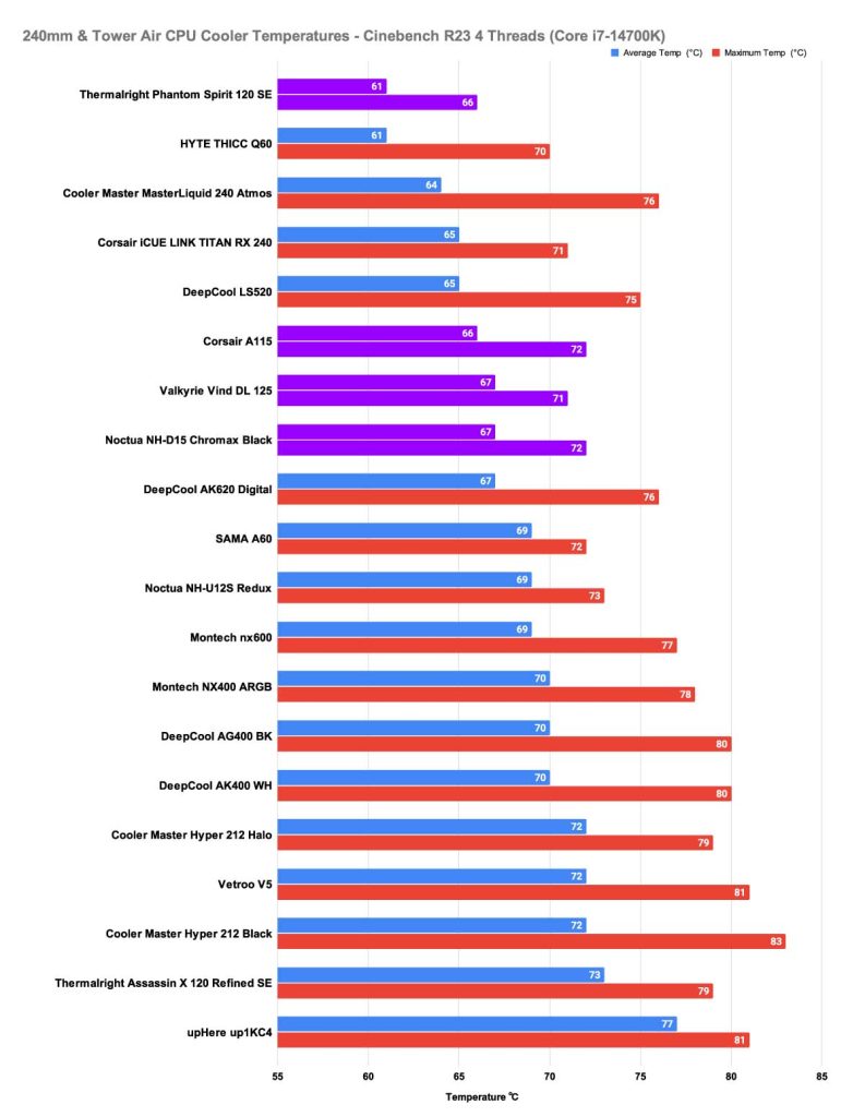 During our Cinebench 4‑Thread test, which simulates light workloads or gaming scenarios, the Thermalright Phantom Spirit 120 SE leads the pack, outperforming four different 240mm AIOs and holding both lower average (61 ℃) and maximum (66 ℃) temperatures than any of them.