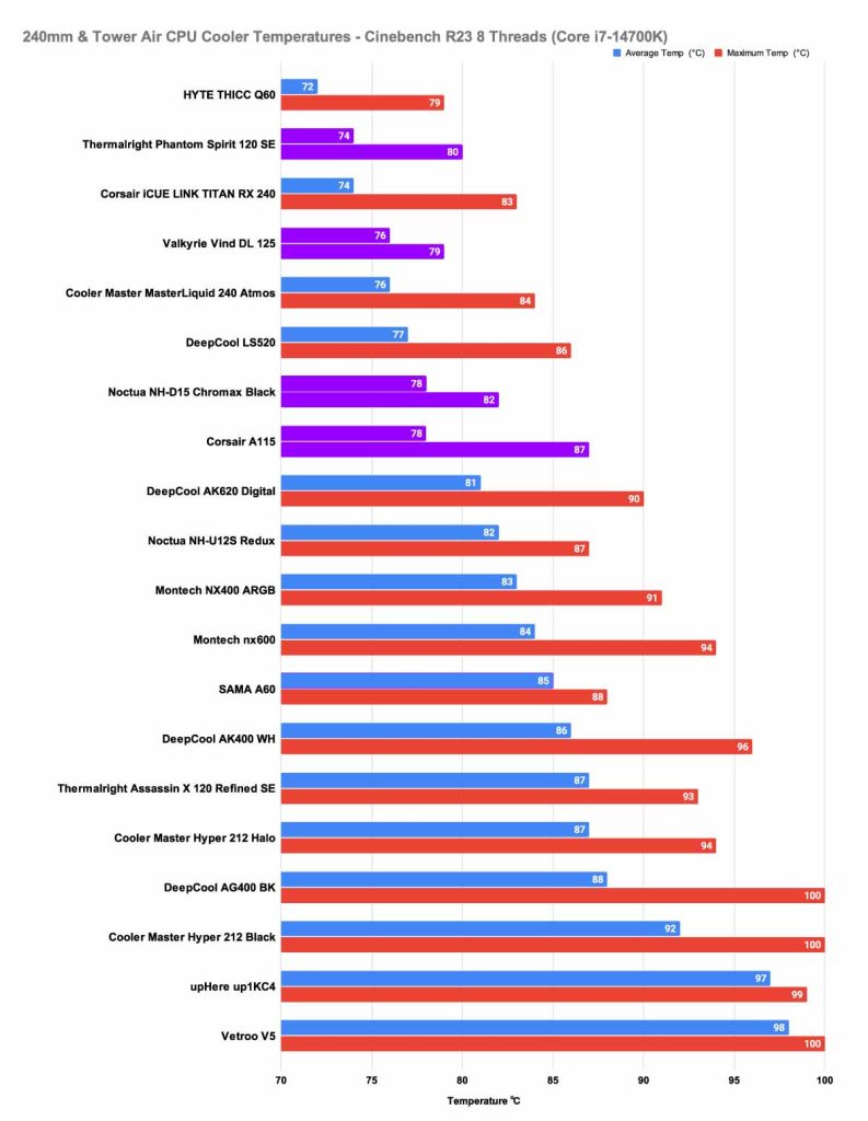 Second among our recommendations is the Corsair A115, posting an average of 66 ℃ and a maximum of 72 ℃. The Valkyrie Vind DL125 follows closely with an average of 67 ℃ and a slightly lower maximum of 71 ℃, while the Noctua NH‑D15 lands just behind, also averaging 67 ℃ but peaking at 72 ℃.