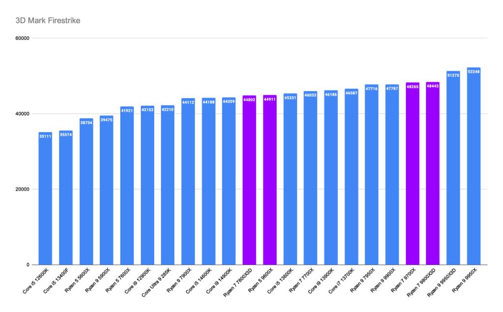 3D Mark Timespy FireStrike is our final benchmark to show just how well-suited these CPUs are for the RTX 5080. The test runs two demanding DX12 game-like scenes packed with intense lighting, shadows, and particle effects, reflecting the realities of modern hardware. While FireStrike leans more heavily on the GPU than TimeSpy, it also highlights how efficiently a CPU manages multiple threads and exposes bottlenecks that can hold back GPU performance.