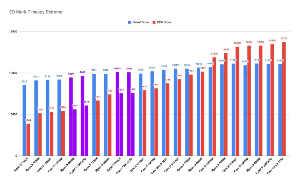 Our second-to-last benchmark is 3DMark’s TimeSpy Extreme, which is a 4K render workload equivalent to a video game. With an overall score of 10069 and a CPU score of 7567, the Ryzen 7 9800X3D edges ahead in raw compute throughput. Interestingly, the Ryzen 7 9700X posts a slightly higher overall score of 10092, though its CPU score of 7531 falls just short of the 9800X3D, highlighting how close the two chips really are in performance. The older Ryzen 7 7800X3D trails behind with an overall score of 9645 and a CPU score of 6073, while the Ryzen 7 9600X sits at the bottom with 9429 overall and 5607 on the CPU test. Taken together, these results show that while the non‑X3D 9700X can match or even surpass the 9800X3D in synthetic overall scoring, the extra cache of the X3D model still gives it a slight edge in CPU‑focused workloads, reinforcing its positioning as the RTX 5080’s best processing companion.