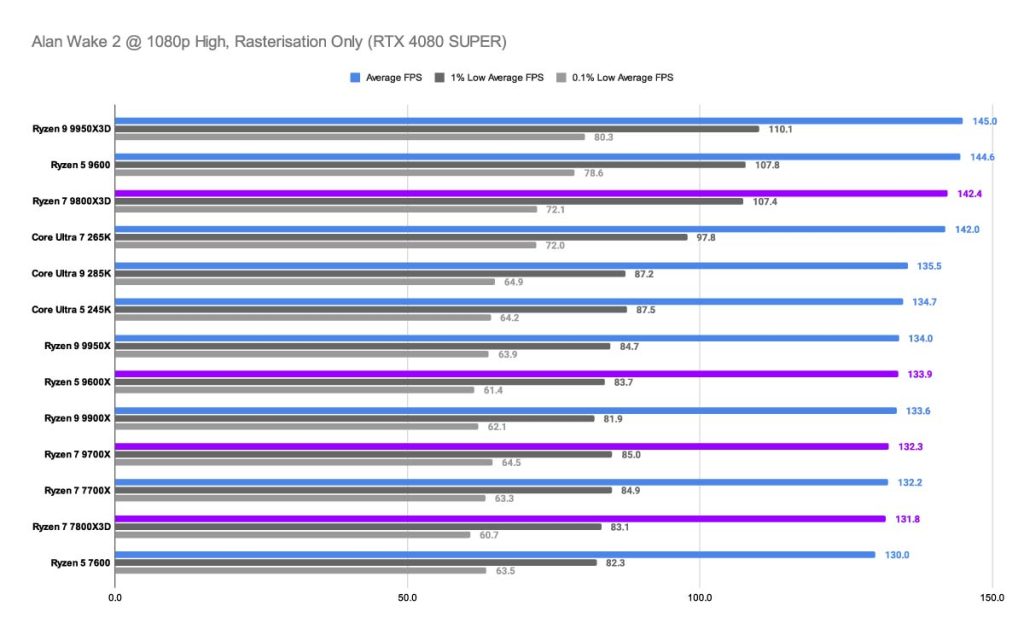 Even though the AMD Ryzen 7 9800X3D still leads with an impressive 142.3 FPS, the ranking among the other processors shifts compared to Call of Duty: Black Ops 6. Unlike Black Ops 6, which is heavily cache‑bound, Alan Wake 2 is far more graphically demanding. As a result, the newer Ryzen 9000‑series chips edge ahead of the 7800X3D, reflecting how modern titles are often optimised for the latest architectures. The Ryzen 5 9600X averaged 133.9 FPS, followed closely by the 9700X at 132.3 FPS. The 7800X3D trailed slightly at 131.8 FPS, but it’s worth noting that this is still an excellent framerate. In this case, performance is driven more by GPU power than by the CPU’s cache advantage, explaining why the 7800X3D sits lower in the chart despite its strong showing in cache‑sensitive workloads.