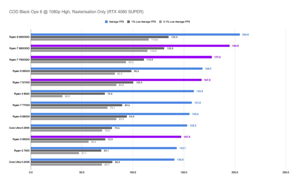 In this graph, the two CPUs equipped with AMD’s 3D V‑Cache stand above the 9600X and 9700X. Call of Duty: Black Ops 6 is a cache‑bound game, so processors with larger L3 caches can store and access more game data directly on the chip, reducing latency and boosting frame rates. The 9800X3D leads the pack with an average of 194.9 FPS, followed by the 7800X3D at 177.2 FPS. Then the 9700X produces a framerate of around 176, and lastly the 9600X pulls in a lower 147.3. What’s important to remember is that a framerate over 60 FPS in competitive games is more than enough to provide a fluid, enjoyable experience.