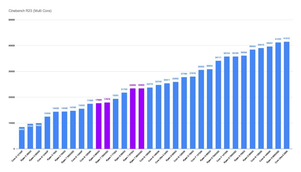Stepping down a tier, the Ryzen 7 7800X3D posted 17,972 points, while the Ryzen 5 9600X followed closely at 17,669. This spread illustrates how AMD’s higher-core-count parts maintain a significant advantage in rendering tasks, while the midrange models still offer strong multi-core efficiency for their class. The near parity between the 9800X3D and 9700X suggests architectural refinements rather than cache size are driving performance at the high end, whereas the gap to the 7800X3D and 9600X underscores the scaling benefits of having additional cores and threads in workloads that require more cores.