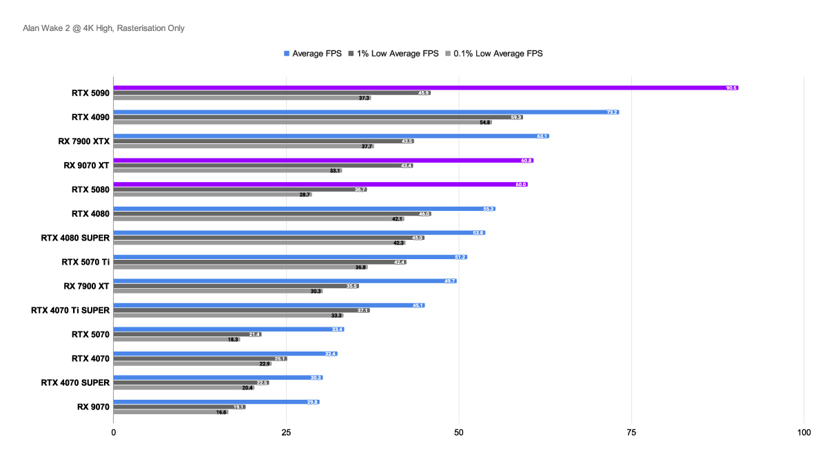 Alan Wake 2 is widely praised for its graphics. It is visually captivating across all platforms, but you need the right kit to fully harness its visual fidelity, especially at 4K. 4K demands serious GPU muscle to maintain fluidity across its dense lighting, particle effects, and cinematic environments. The RTX 5090 leads the group with an average of 90.5 FPS, but what’s more impressive is its 1.0% low of 45.9 FPS and 0.1% low of 37.3 FPS. This indicates not just raw speed but exceptional frame consistency, resulting in fewer stutters and smoother gameplay even during intense sequences. The RTX 4090 trails, averaging 73.2 FPS. However, its 1.0% and 0.1% lows, at 59.3 and 54.8, respectively, are actually higher than the RTX 5090’s. This suggests tighter frame pacing and less variance, although the overall framerate is lower.