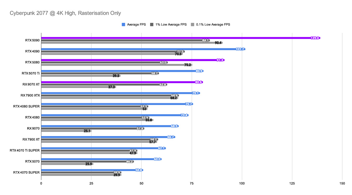 Cyberpunk 2077 at 4K is one of the most demanding titles on the market, and these results highlight just how wide the gap is between NVIDIA’s flagship cards and the rest of the field. The RTX 5090 dominates with an average of 139 FPS, paired with 84.1 FPS at the 1.0% low and 90.4 FPS at the 0.1% low. That combination is unusual, since the 0.1% low is higher than the 1.0% low, but it points to remarkable frame stability and recovery during the most taxing moments. The RTX 4090 follows with an average of 101.7 FPS, 71.5 FPS at 1.0% low, and 70.5 FPS at 0.1% low, showing a more traditional curve and consistent pacing, though it cannot match the sheer headroom of the 5090.