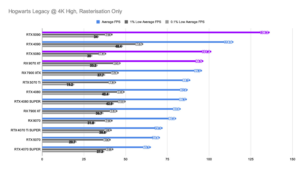 The RTX 5080 achieves 101.3 FPS on average, but its lows of 38.3 FPS and 30 FPS highlight the inconsistency that may be felt during traversal or combat. AMD’s RX 9070 XT posts 96.5 FPS average, with lows of 47.0 FPS and 33.2 FPS. AMD card delivers playable framerates but lacks the stability seen in NVIDIA’s higher-end offerings. In summary, the RTX 5090 sets the highest ceiling for raw performance, while the RTX 4090 balances strong averages with more consistent lows, making it the smoother option for 4K Hogwarts Legacy gameplay.