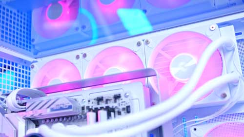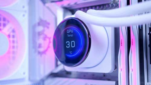 The APNX has a particularly unique method of horizontally mounting radiators within the dual-chamber style region, and for this build, we were excited to trial this feature. This 360mm all-in-one CPU Cooler is engineered for gamers seeking strong performance and cutting-edge aesthetics with vibrant colours. Equipped with a 2.1-inch LCD screen that has a fully curved glass cover and a water block inspired by the smooth contour of a water droplet, it delivers both visual elegance and functional clarity. Users can monitor their system’s stats in real-time, display animated visuals, or view personalised content, all while complementing the build’s fluid design language. To use this feature, you will need the MSI CENTER application.