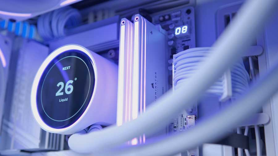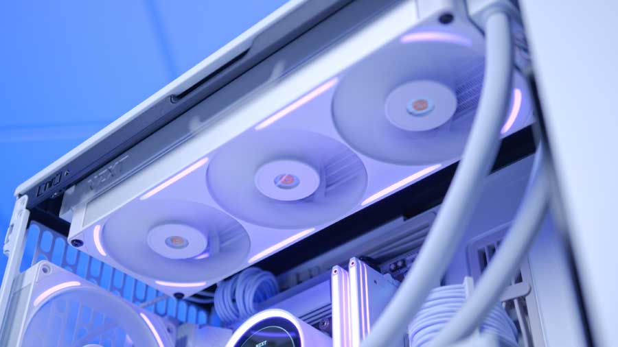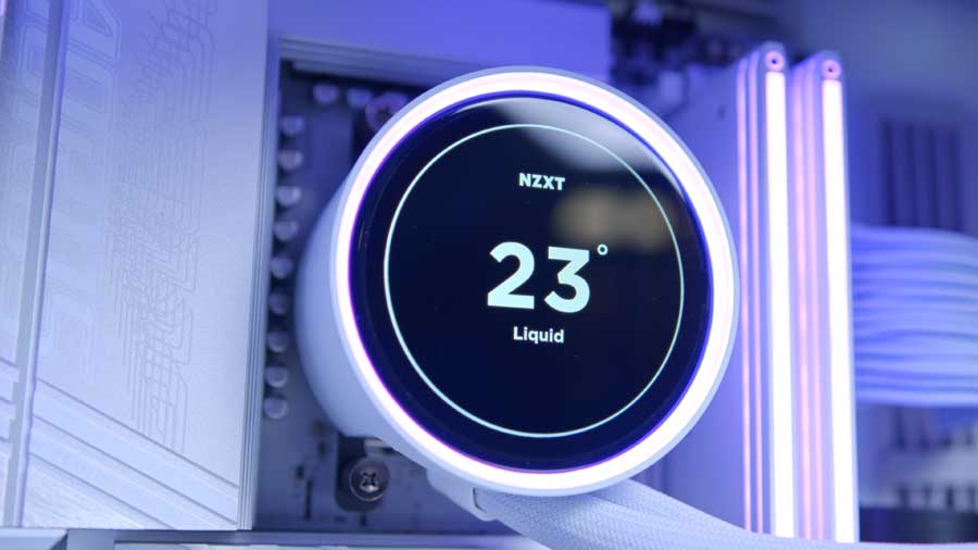 The version installed in our build features a 360mm radiator paired with a 2.72‑inch LCD screen. The display can be customised to show your favourite GIFs or images, monitor real‑time system performance, and even integrate with platforms like Spotify and YouTube. NZXT has also streamlined cable management: the single‑frame fans reduce clutter, while a redesigned cabling system routes wires through the tubing for a cleaner, more minimalist look that complements the chassis.