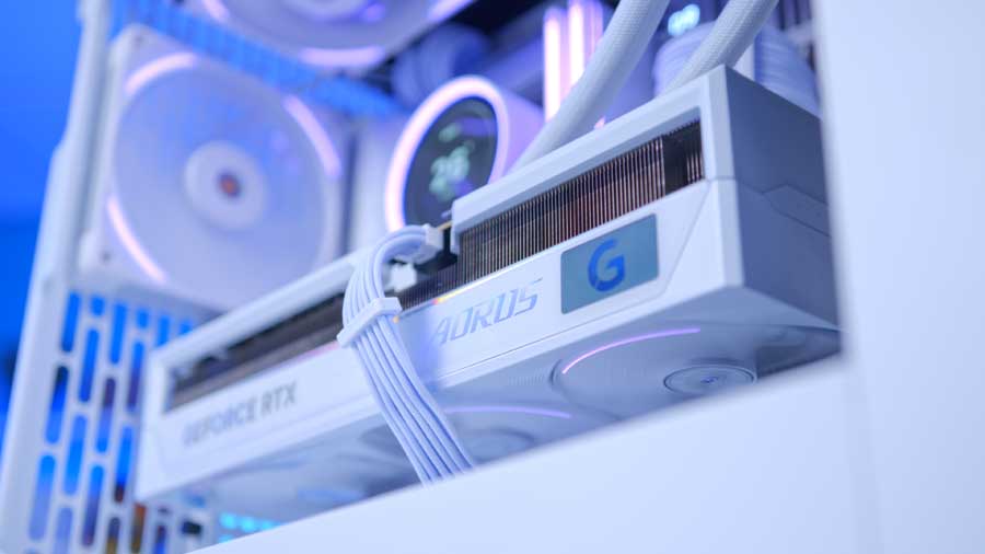 GIGABYTE’s AORUS GeForce RTX 5090 Master ICE is our white GPU of choice for this build, and it’s nothing short of extravagant. From its customisable RGB accents to the integrated LCD display, this card blends premium aesthetics with exceptional engineering. It’s a centrepiece component designed to stand out visually while delivering uncompromising performance.