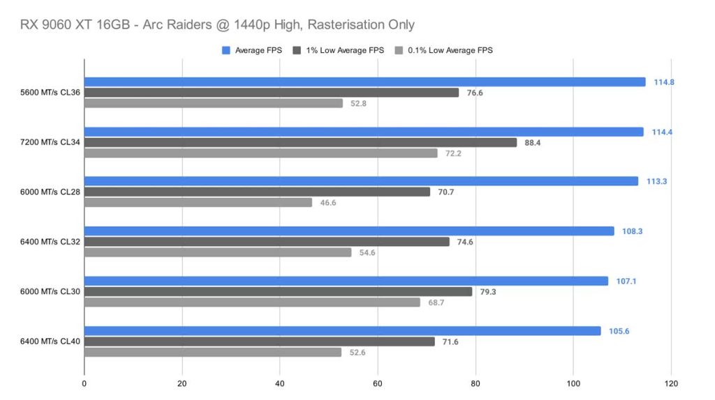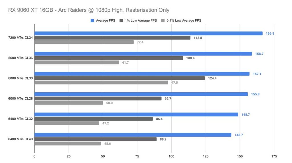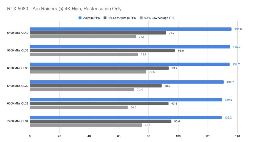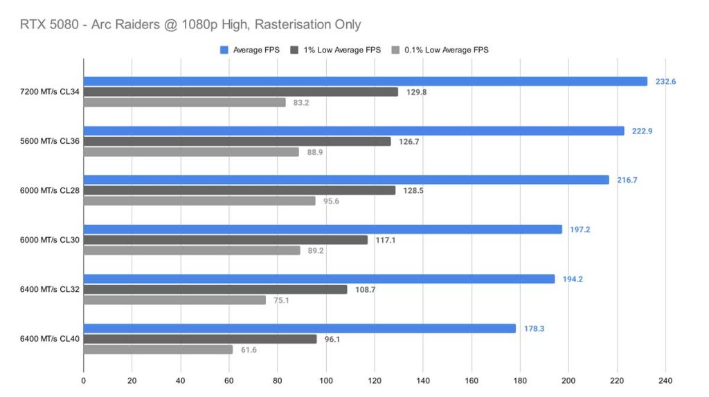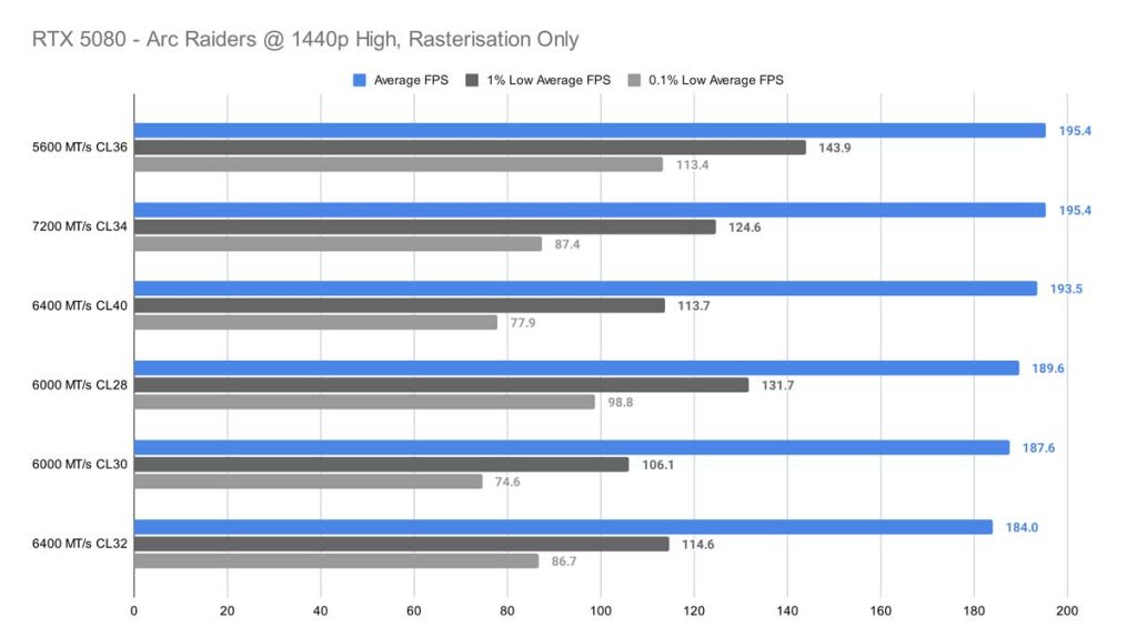At 1080p, Arc Raiders finally gives us something resembling a pattern. The 7200 MT/s CL34 kit pulls ahead by a noticeable margin, standing out as the clear top performer in this test. Surprisingly, the 6400 MT/s CL32 kit – which you’d normally expect to rank near the top thanks to its tighter timings and strong compatibility with Ryzen 9000‑series CPUs – doesn’t fare nearly as well here. Even if you sift through the 0.1% lows, there’s no real correlation to find here either.