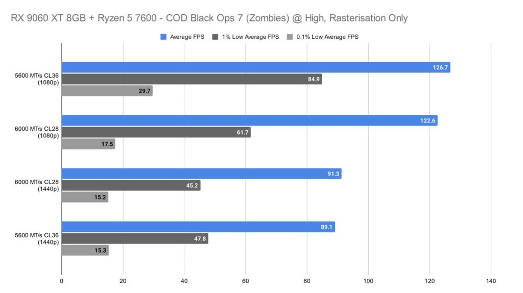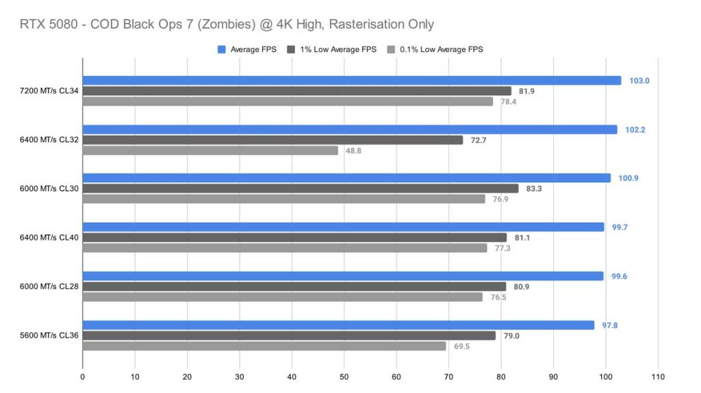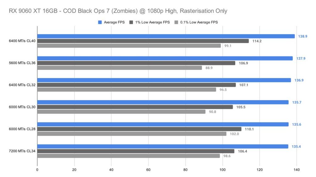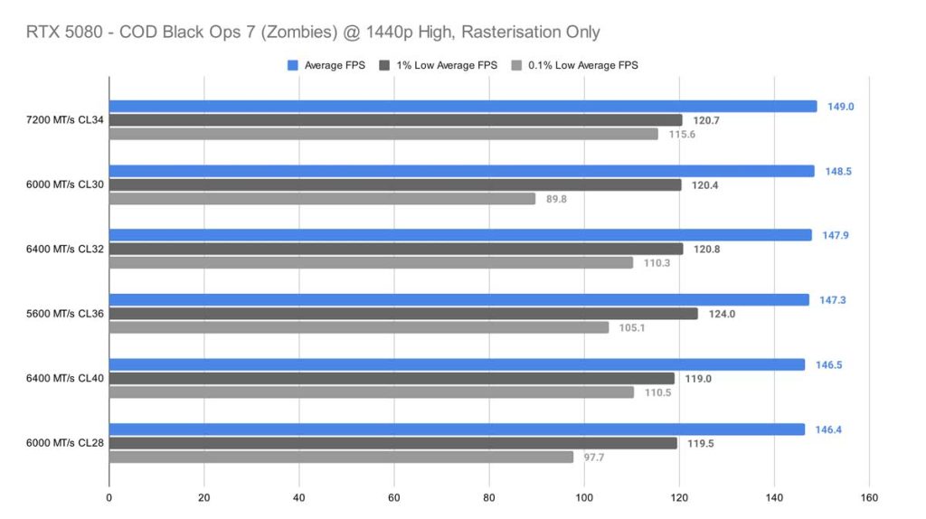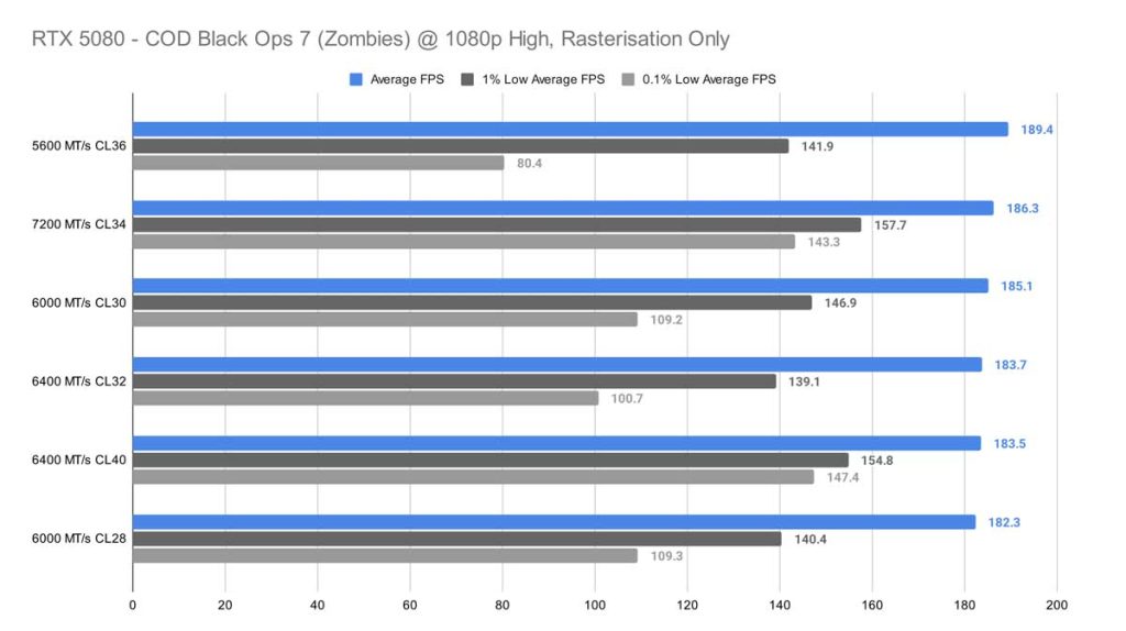 Call of Duty: Black Ops 7 (Zombies) offered a completely different story than Cyberpunk 2077 did in 1080p, where, strangely enough, the 5600 MT/s CL36 kit offered more frames on average and much more stability than the 6000 MT/s CL28 kit did.