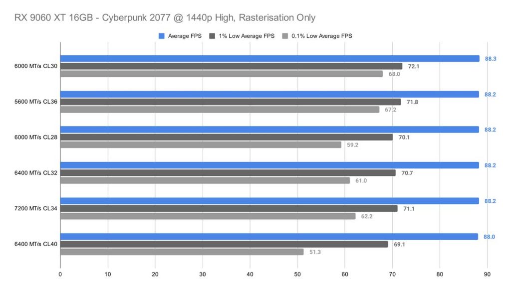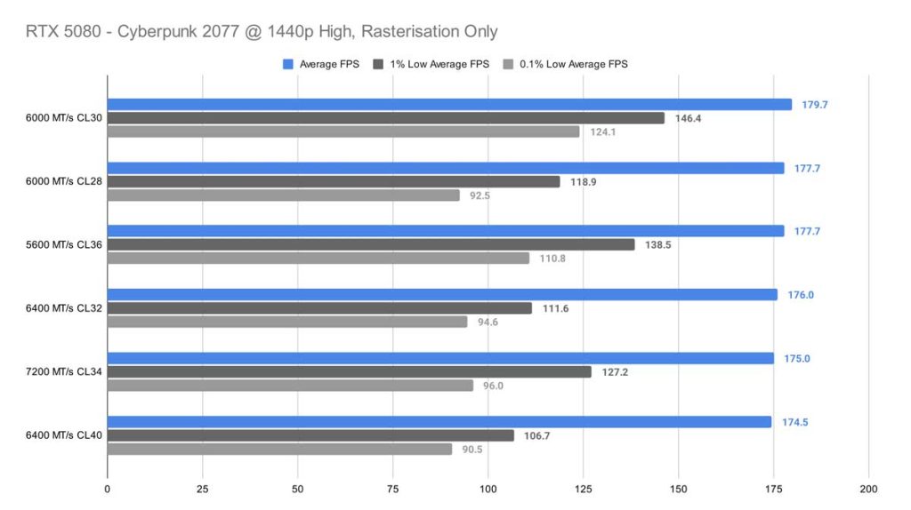 1440p, however, allowed the 6000 MT/s CL28 kit to function better, ever so slightly gaining on the other kit with a 2.2 FPS lead, but the 5600 MT/s CL36 still wins in terms of stability for both 1% and 0.1% lows.