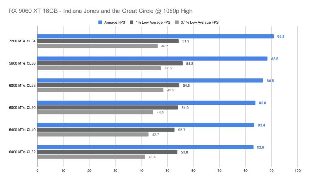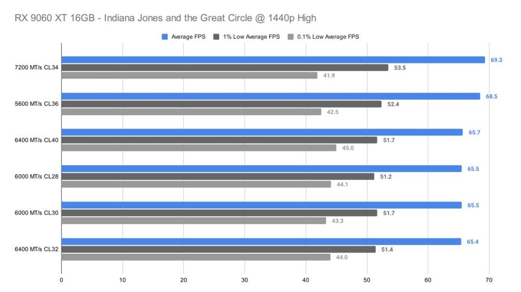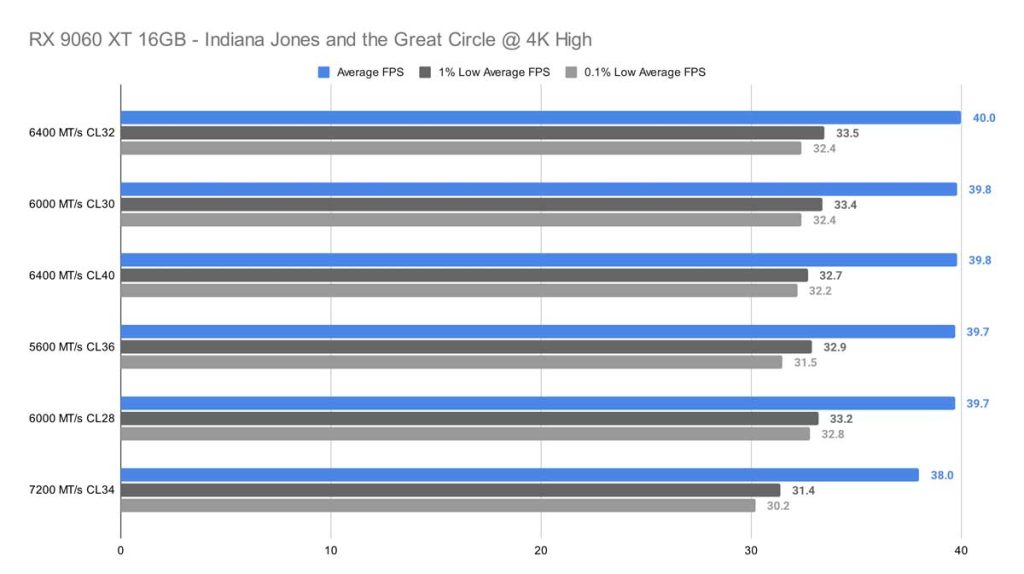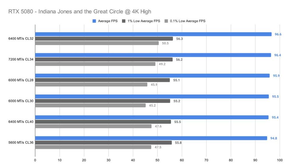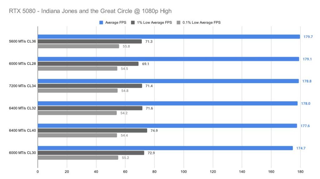 Across all three resolutions – 1080p, 1440p, and 4K – Indiana Jones and the Great Circle shows very little variation between memory kits. At 1080p, after removing the weakest outlier (the 6000 MT/s CL30 kit), the remaining kits differ by only about 2 FPS on average, which is effectively indistinguishable in real‑world gameplay.
