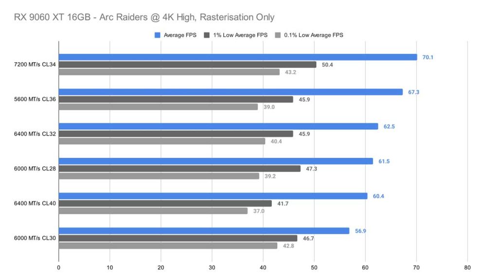 For 4K high, Arc Raiders sees around a 7 FPS difference between best and worst kits, and 1% and 0.1% lows are fairly consistent across the board as well – unfortunately, there’s not much of a pattern between our results for this test to give an indication of which kit is either best or worst for this game.