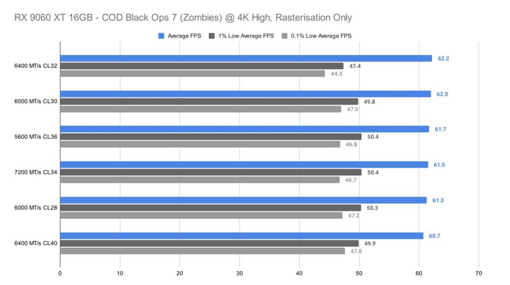 4K resolution shows us that the gaps between the different memory kits tighten, with a margin of 1.5 frames between all the kits together. The maximum framerate was achieved by the 6400 MT/s kit CL32 this time, averaging 62.2 FPS.