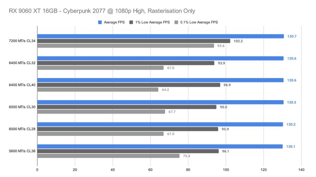 In our 1080p High test for Cyberpunk 2077, the differences between memory kits were surprisingly small. The top‑performing 7200 MT/s CL34 kit and the bottom‑performing 5600 MT/s CL36 kit were separated by only 0.6 FPS on average – essentially indistinguishable during gameplay. The real separation appeared in the 0.1% lows, where the 7200 MT/s kit pulled far ahead with 93.6 FPS, compared to 75.4 FPS from the 5600 MT/s CL36 kit. The next lowest 0.1% result dropped further to 67.7 FPS, showing that while average FPS remains flat, faster memory can still improve frame time stability in this title.