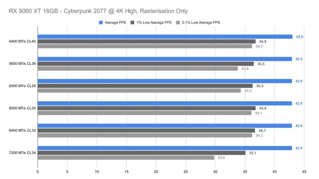 At 1440p High, the order of the graph shifts again, with the 6000 MT/s CL30 kit taking the top spot – but only by 0.3 FPS over the lowest result. This margin is far too small to be meaningful in real‑world play. By the time we reach 4K, the gap shrinks even further to just 0.1 FPS, with most kits clustering around 42.9 FPS. The consistency is impressive, even if the overall framerate isn’t ideal for smooth gameplay.