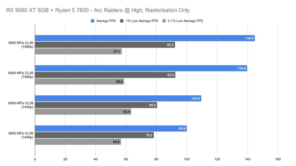 Again, at 1080p with High graphics settings, the 5600 MT/s CL36 kit beats out the 6000 MT/s CL28 kit, and it aided the system in producing 144.9 frames per second, putting it ahead of the other kit by about 5 frames. Similarly to COD, Arc Raiders in 1440p lets the 6000 MT/s CL28 kit shine, gaining 10 more frames than the 5600 MT/s CL36 kit, offering better frame pacing in even the most challenging moments.