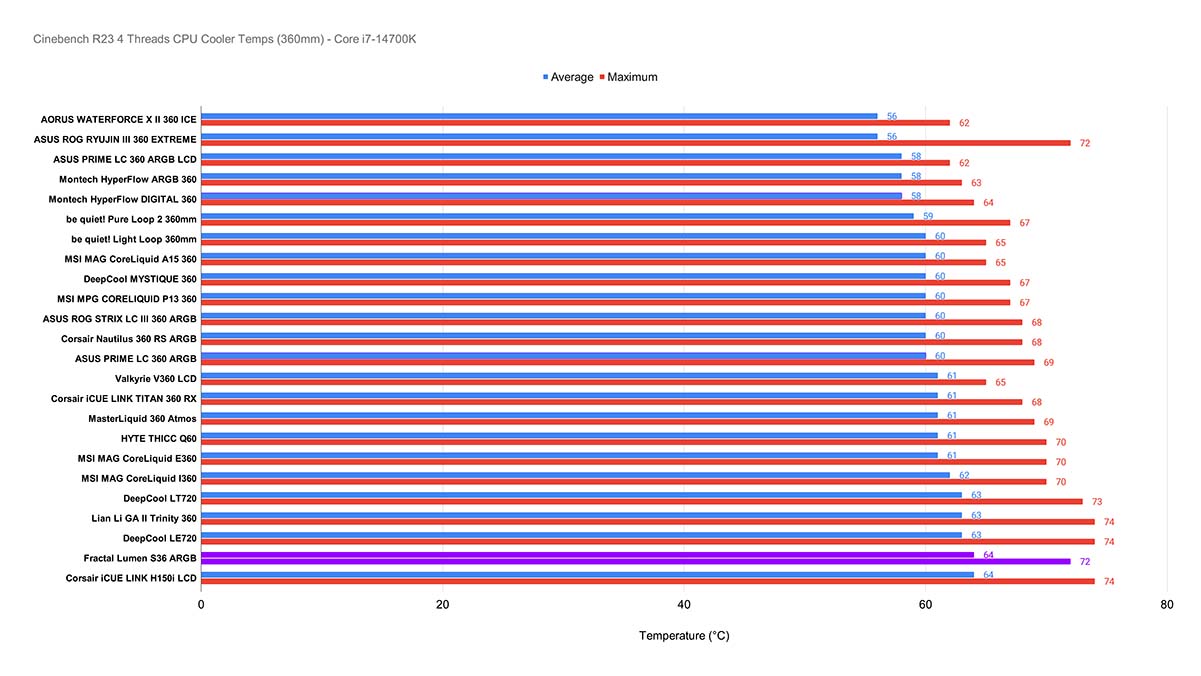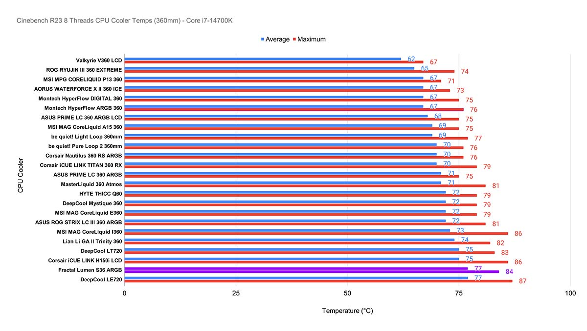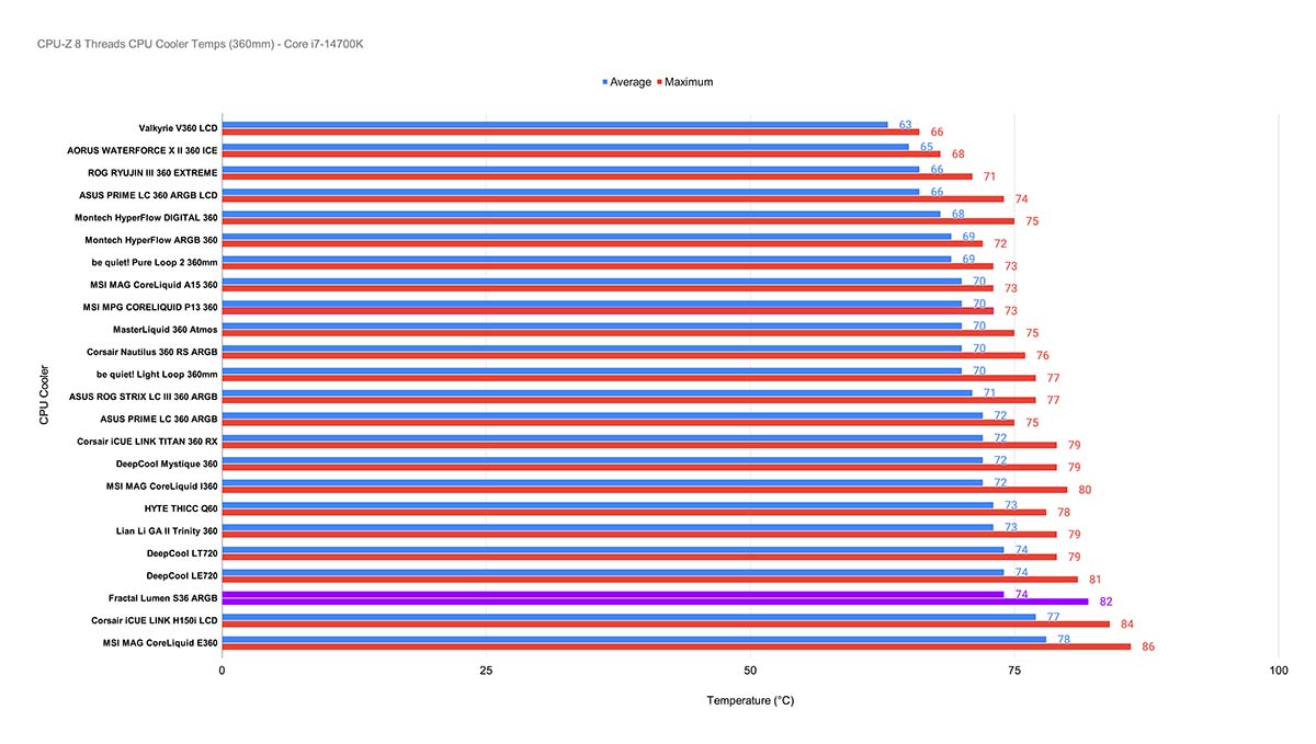 Interestingly, the difference between the average and maximum temperatures achieved by the Lumen S36 is of a consistently smaller size than the large majority of coolers in the bottom half of our graph. The Lumen S36 providing consistent, if not chart topping performance.