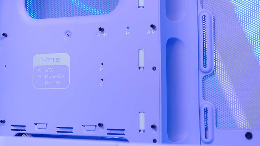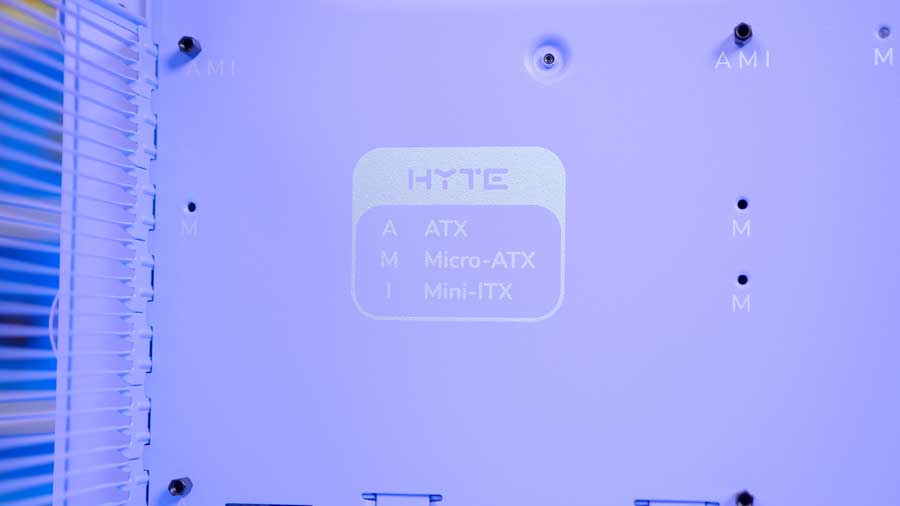 Moving on to the case’s internals, the motherboard tray greets us with a handy key indicator showing how the motherboard standoffs align for specific motherboard types, in a metallic, complementary silver print. This is an incredibly thoughtful quality-of-life feature for new builders, as it ensures that you can’t get it wrong!