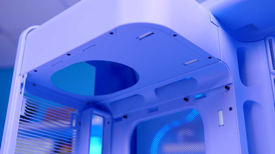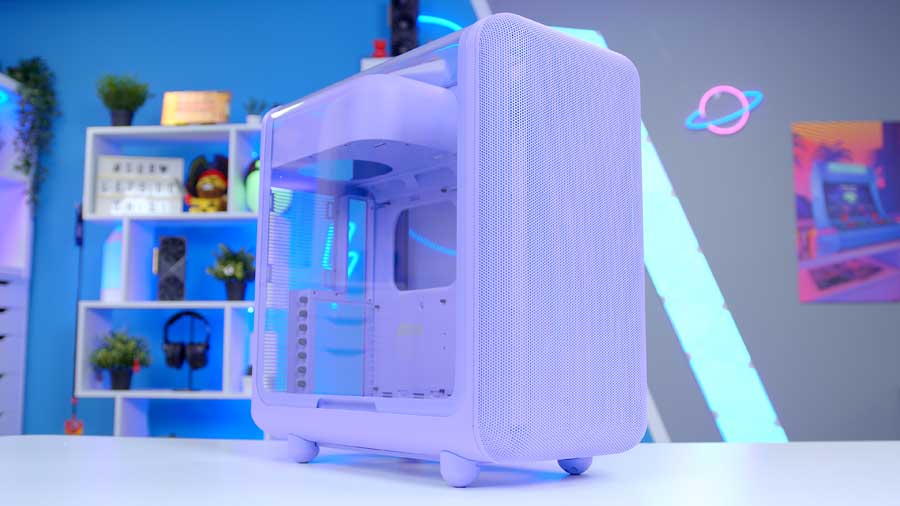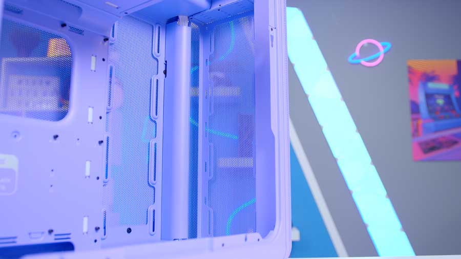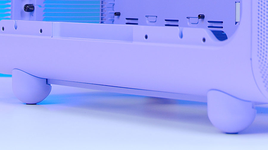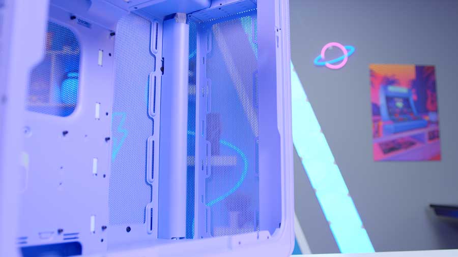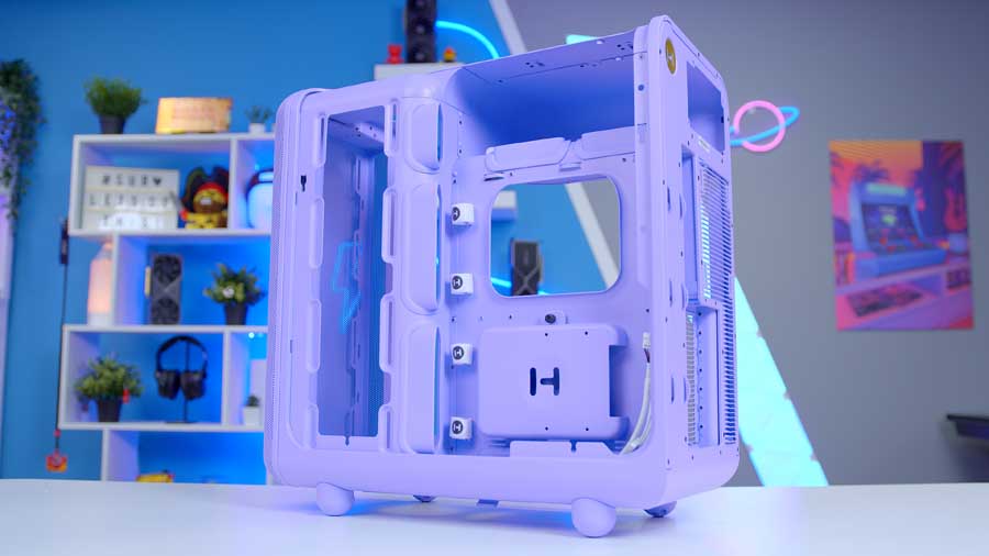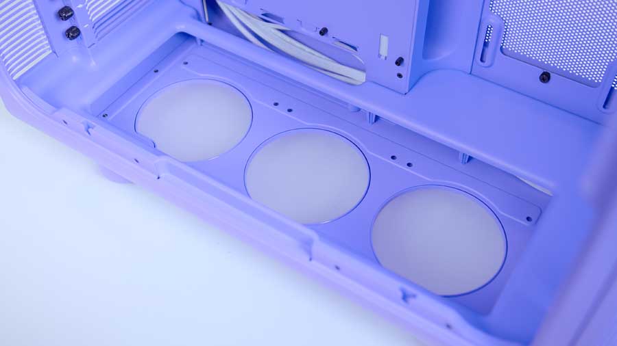Located on the near side of the top panel, as part of a thin bezel where the glass panel slots in, is the case’s front I/O. It features two USB Type-A ports, one USB Type-C port, a combo audio/mic jack, and a tactile mechanical power button. The cable routing for the front IO is hidden within an internal purple column to maintain an uninterrupted visual flow in your build.