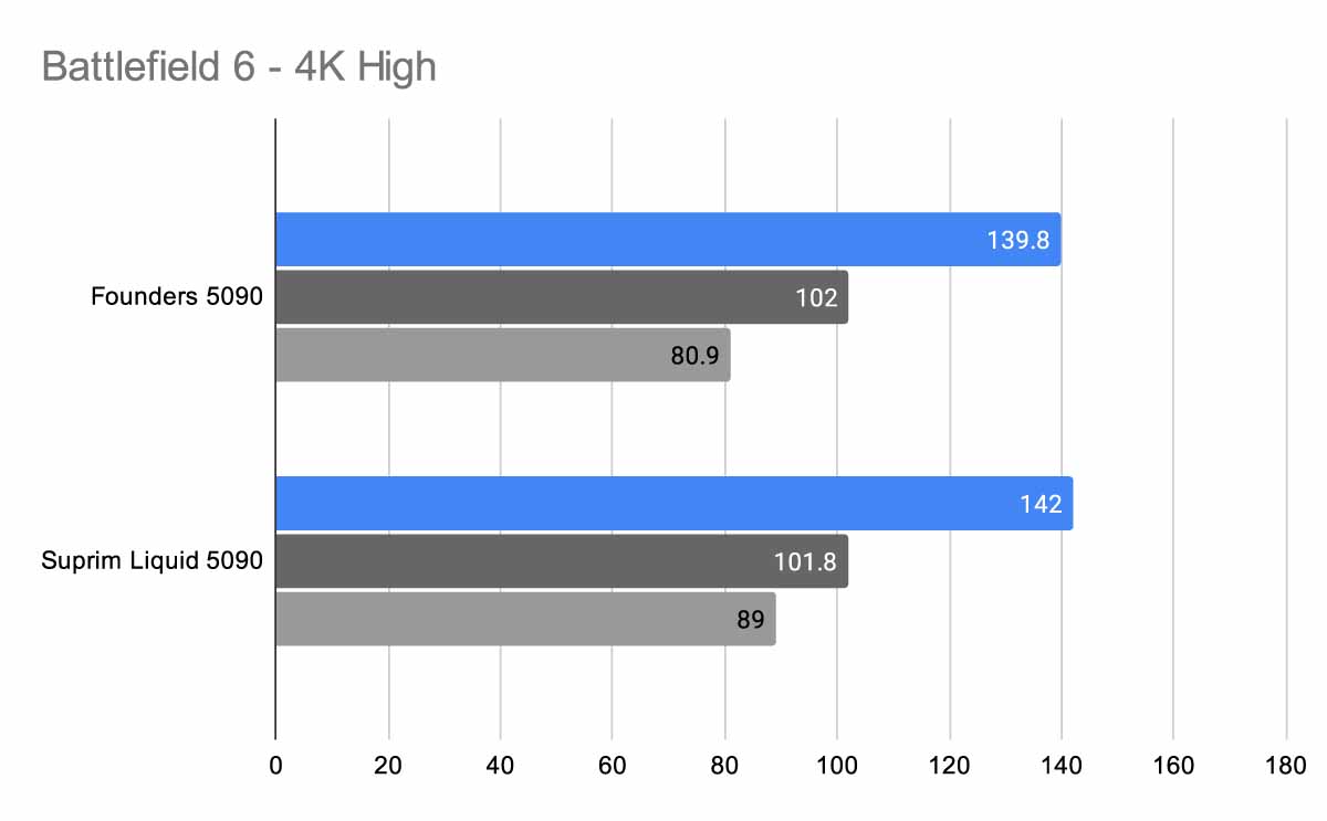 In Battlefield 6, the newest addition to our benchmarking suite at the time of writing, both GPUs performed as expected, eclipsing the 100 FPS mark with ease. The SUPRIM Liquid does pip the Founders edition to the performance crown here by roughly 3 FPS and while the framerate difference here is negligible for the most part, the temperatures are vastly different.