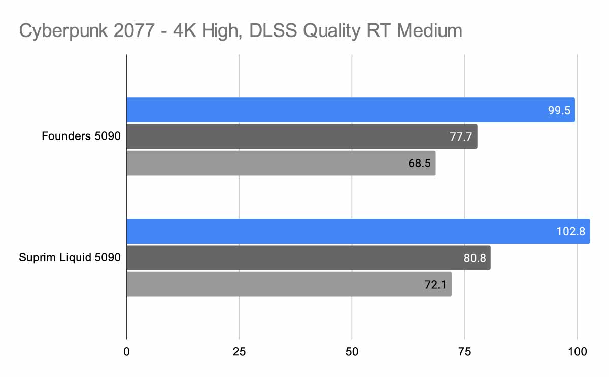 So, performance. To test the SUPRIM Liquid RTX 5090, we pitted it against the Founders Edition RTX 5090 in a head-to-head comparison spanning 3 titles; Battlefield 6, Cyberpunk 2077 and Marvel Rivals. For Battlefield 6 and Marvel Rivals, settings were tuned to 4K High rasterised settings, with Cyberpunk taking things up a notch to 4K High settings, this time with DLSS Quality enabled and Raytracing set to Medium.