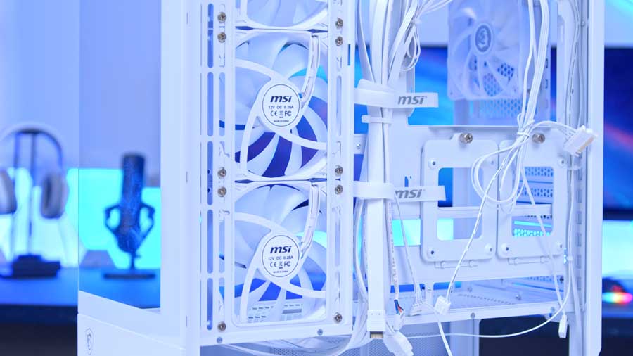 The pre‑installed fans are also tied into this hub, and MSI has thoughtfully used reverse‑blade fans on the side to ensure their ARGB effects remain unobstructed by the fan frames. Cable management is aided by included Velcro straps and tie‑down points, though the hub does leave a fair number of cables to organise.