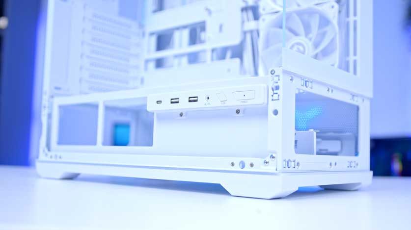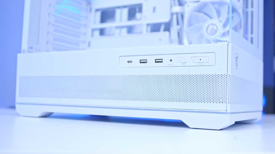 The front I/O is mounted horizontally along the metal side panel, which does limit positioning options. Placing the case on the right side of a desk makes ports more accessible, but on the left side, they can be harder to reach and more prone to accidental nudges when devices are connected.