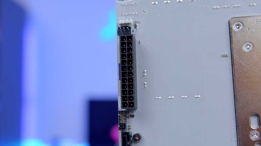 For motherboard power, MSI has equipped the MAG X870E TOMAHAWK WiFi PZ with a standard 24-pin connector, located on the left side of the reverse. Ensure a firm push when plugging the cables into these connectors, as they can be pretty stiff.