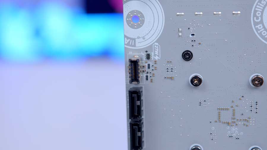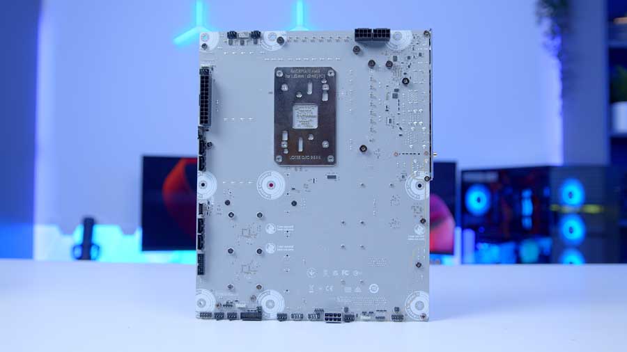 Moving to the back, you’ll find all the power connectors and headers for the board. The unique feature of PROJECT ZERO motherboards is that all connectors are located on the reverse side of the PCB. By doing this, it keeps the front of your build cable-free, providing a much neater aesthetic. However, there are some caveats. The first of which is that it requires a specific case that supports the design, as the position of the connectors on the board necessitates specific cutouts around the motherboard tray.