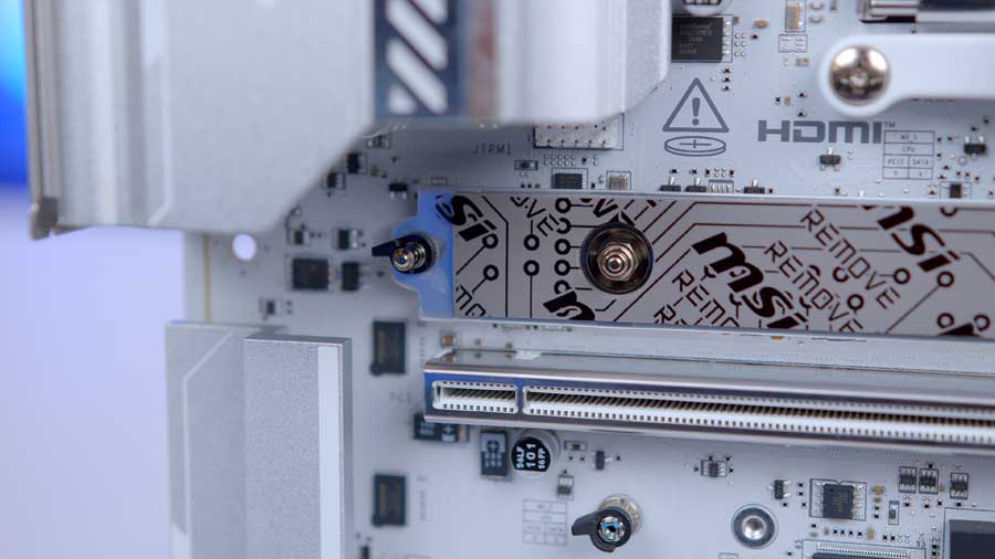 The MAG X870E TOMAHAWK MAX WiFi PZ offers four M.2 slots, two Gen5 and two Gen4. All of these are located underneath the screw-in heatsinks towards the centre portion of the board. Once the heatsinks are removed, it’s reasonably straightforward to install any new drives by using the tool-less latch mechanism that holds the drives in place.