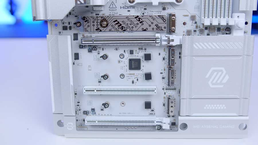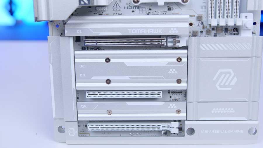 On the RAM front, the MAG X870E TOMAHAWK MAX WiFi PZ comes equipped with four DIMM slots, all colour-coded to the white PCB. This board allows you to install a maximum of 256GB at 8400MT/s. I’m a massive fan of the white RAM DIMMs. While this may seem like a relatively minor design element to rave about, it’s not common to see white RAM slots, so I’m glad MSI has opted to maintain the white theme throughout the entire board.