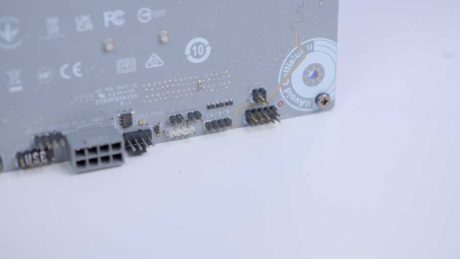 On the rear of the motherboard, you’ll find a vast selection of PWM headers to plug in your CPU liquid coolers and fans. The top left of the board offers three headers: CPU_Fan, Pump/Sys Fan, and Sys Fan 1. Dotted around the rest of the board are four additional system fan headers providing ample space to plug in fans across the entirety of your motherboard.