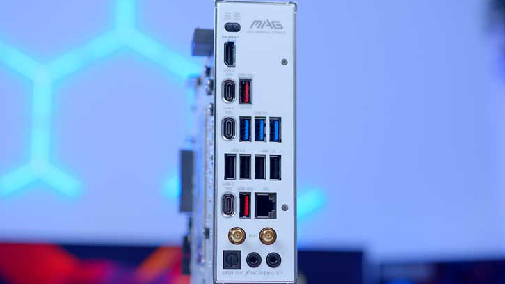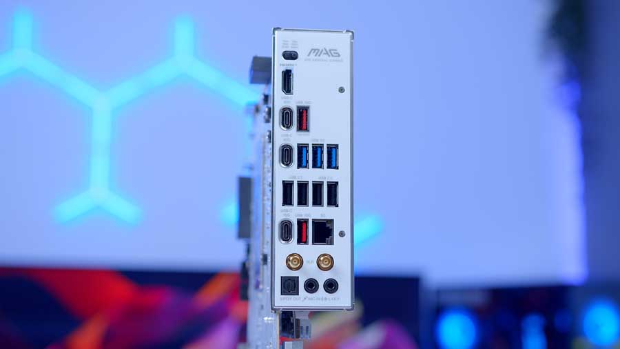 Rear IO is a definitive strong point for the MAG X870E TOMAHAWK MAX WiFi. X870E chipset boards are geared towards high-end system builders, so it’s no surprise to see a bountiful number of blazing-fast ports. There are twelve in total, four of which are USB 2.0, and the remaining eight are comprised of USB 3.2 Gen 1, USB 3.2 Gen 2, and USB 4 ports. If you’re the kind of builder who has numerous high-speed peripherals or external devices that require solid bandwidth, the rear IO here won’t disappoint.