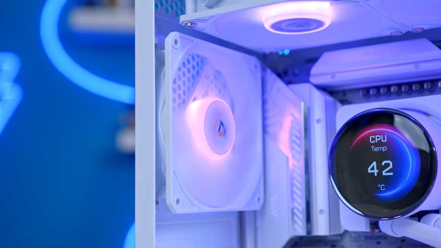 This cooler is available in two colours and is equipped with a 2.1-inch LCD screen that has a fully curved glass cover and a water block inspired by the smooth contour of a water droplet. It delivers both visual elegance and functional clarity. Users can monitor their system’s stats in real-time, display animated visuals, or view personalised content, all while complementing the build’s fluid design language. To use this feature, you will need the MSI Center application.