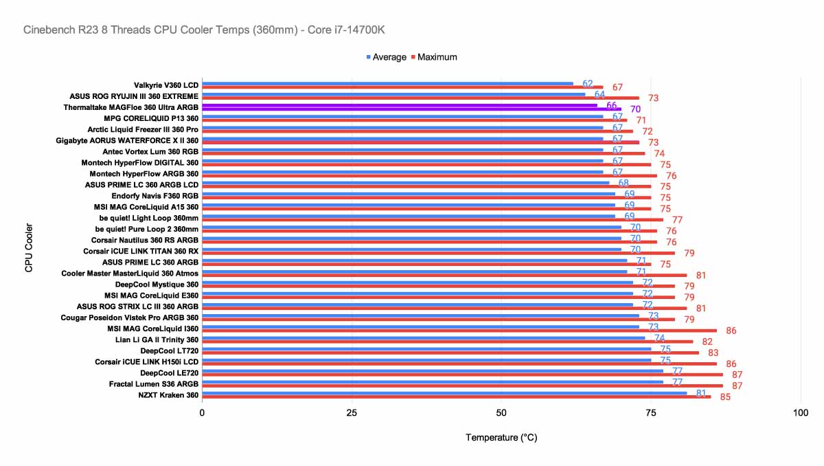 Moving to Cinebench 8-Thread, which ramps up the core utilisation, the MAGFloe 360 Ultra held its ground, remaining in third place, trailing behind the top contenders. Temperatures rose to an average of 66℃, with a peak of 70℃, which is still respectable for a 360mm AIO under heavier load. While it didn’t outperform the Valkyrie V360 LCD or the ASUS ROG RYUJIN III 360 EXTREME in this test, it showed consistent thermal behaviour without erratic spikes, suggesting reliable pump and fan response.