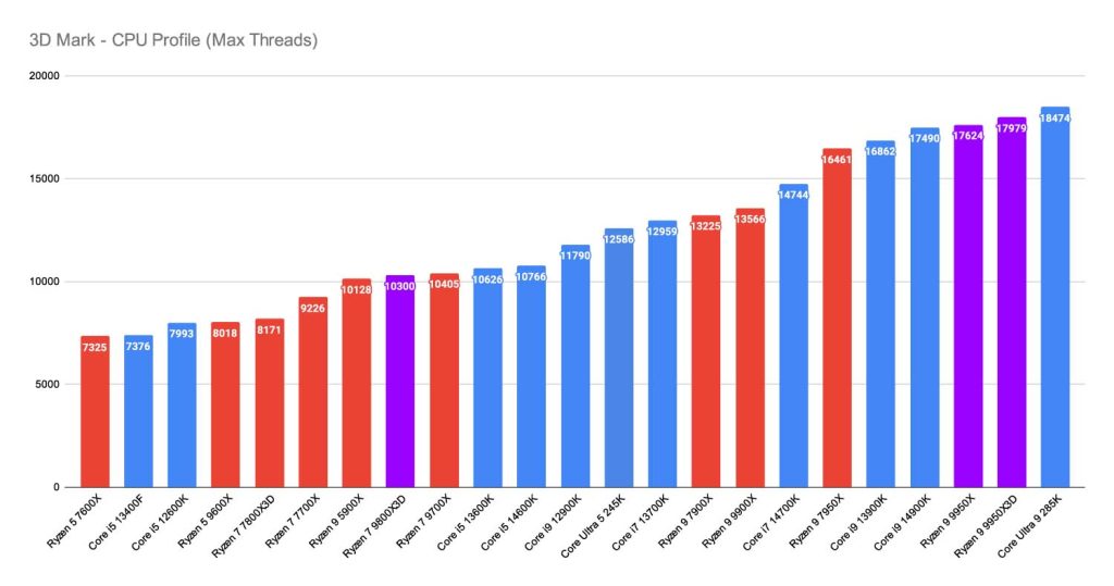 The 3DMark CPU Profile benchmarks CPUs across a range of thread counts, from single-thread up to their maximum. In this test, the AMD Ryzen 9 9950X and Ryzen 9 9950X3D once again lead the pack, finishing just behind the Intel Core Ultra 9 285K. The Intel chip tops the chart with a score of 18,474, while the Ryzen 9 9950X and 9950X3D follow closely with 17,624 and 17,979, respectively. It’s worth considering the Ryzen 9 or Core Ultra 9 if you’re running applications that demand more cores or cache-greedy titles.