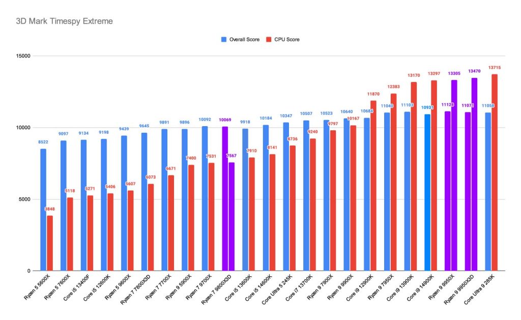 3D Mark Timespy Extreme is similar to running a game at 4K, which is why this benchmark also considers the GPU performance. What this benchmark does explicitly is to test the CPU’s use of a dedicated physics test that evaluates how well your processor handles multi-threaded workloads, simulating game logic and AI behaviour. The Intel Core Ultra 9 285K, AMD Ryzen 9 9950X3D, and AMD Ryzen 9 9950X are top performers in this benchmark, with CPU scores of 13,715, 13,340, and 13,305, respectively. 4K gaming can demand more cores, so seeing these CPUs performing well is no surprise. The Ryzen 7 9800X3D sits more towards the middle of the graph, between the Ryzen 7 9700X and Intel Core i5-13600K, with a CPU score of 10,069.
