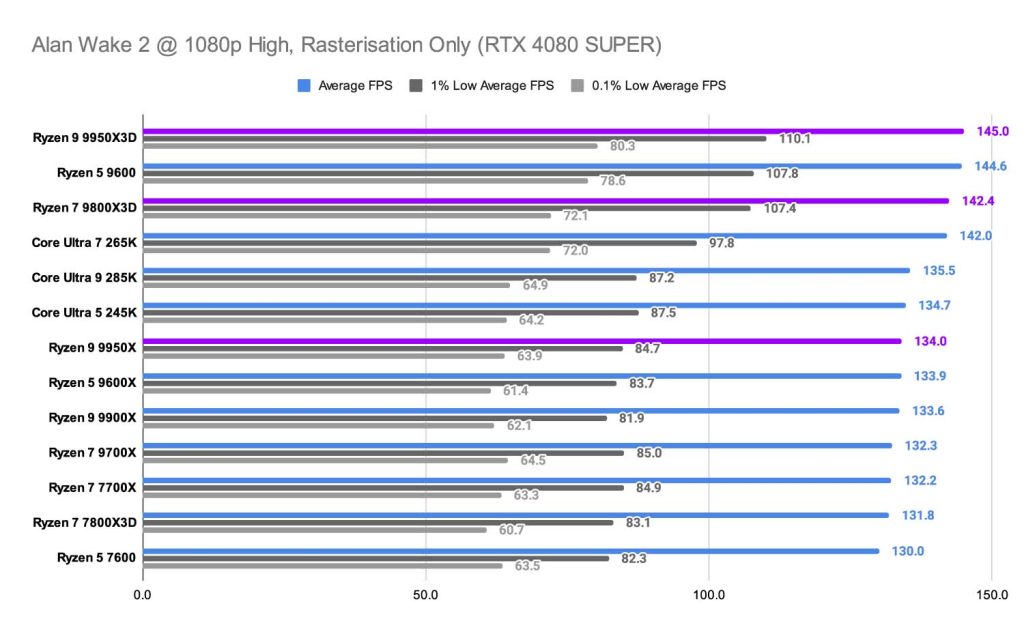 In Alan Wake 2, tested at 1080p, the 9950X3D leads the pack with an impressive average frame rate of 145 FPS, demonstrating its strong ability to handle the game’s demands. The 9800X3D isn’t far behind, delivering a close 142.4 FPS, which emphasises how 3D V-Cache technology continues to enhance gaming performance, especially in CPU-sensitive titles. This statement can be supported by the 9950X being positioned in the middle of the graph, with a frame rate of 134 FPS.
