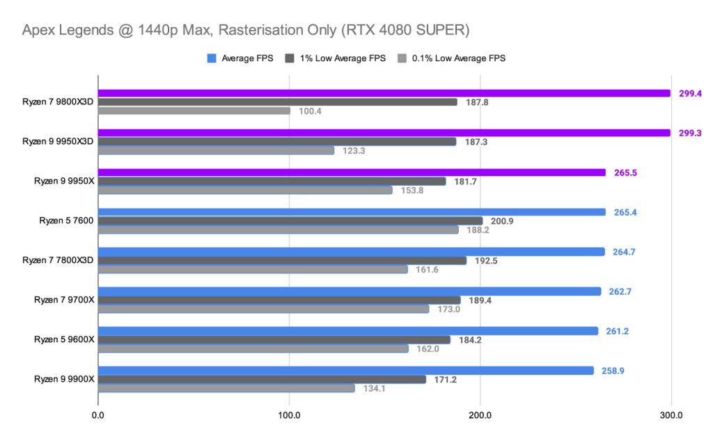In Apex Legends at 1440p, the 9800X3D narrowly edges out the competition with an average frame rate of 299.4 FPS, just barely ahead of the 9950X3D’s impressive 299.3 FPS. This practically neck-and-neck result underscores how, at this resolution, both CPUs deliver near-identical performance levels, again, highlighting the effectiveness of 3D V-Cache technology in maximising gaming throughput.