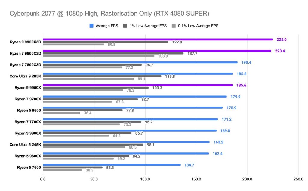 In Cyberpunk 2077 at 1080p, the 9950X3D achieves a strong average frame rate of 225 FPS, with the 9800X3D close behind at 223.4 FPS. In contrast, the 9950X (non-3D variant) clocks in at a solid 185.6 FPS, illustrating the significant uplift that the 3D V-Cache technology brings to demanding open-world titles. This performance gap stresses how architectural enhancements directly translate into smoother, more responsive gameplay at this resolution, where the CPU still plays a critical role.